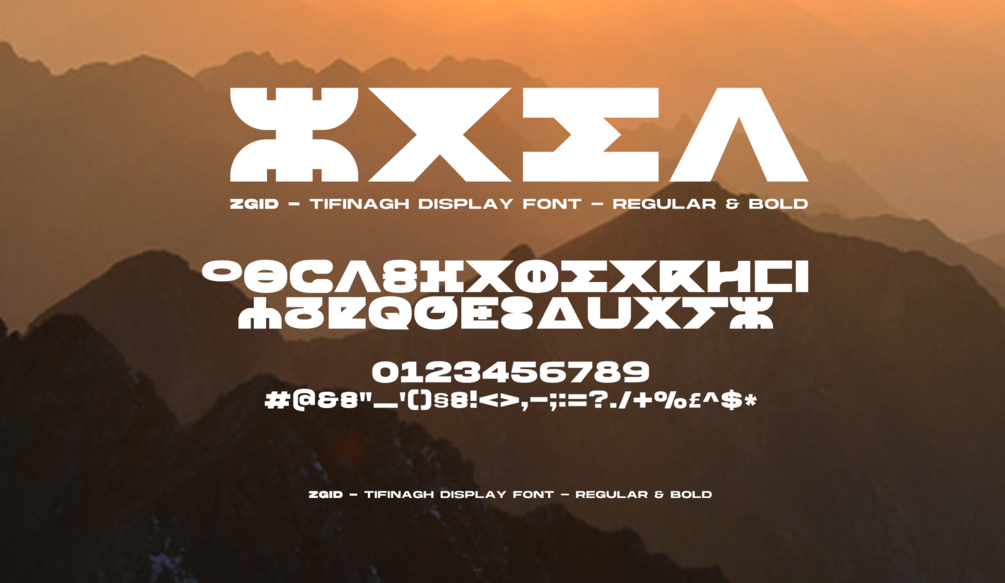 ZGID is a contemporary Tifinagh typeface created by Tarik Raiss under the TIFINA Font Studio project. Designed in Regular and Bold weights, Zgid combines strong geometric forms with cultural authenticity, making it ideal for posters, branding, editorial design, and digital use.